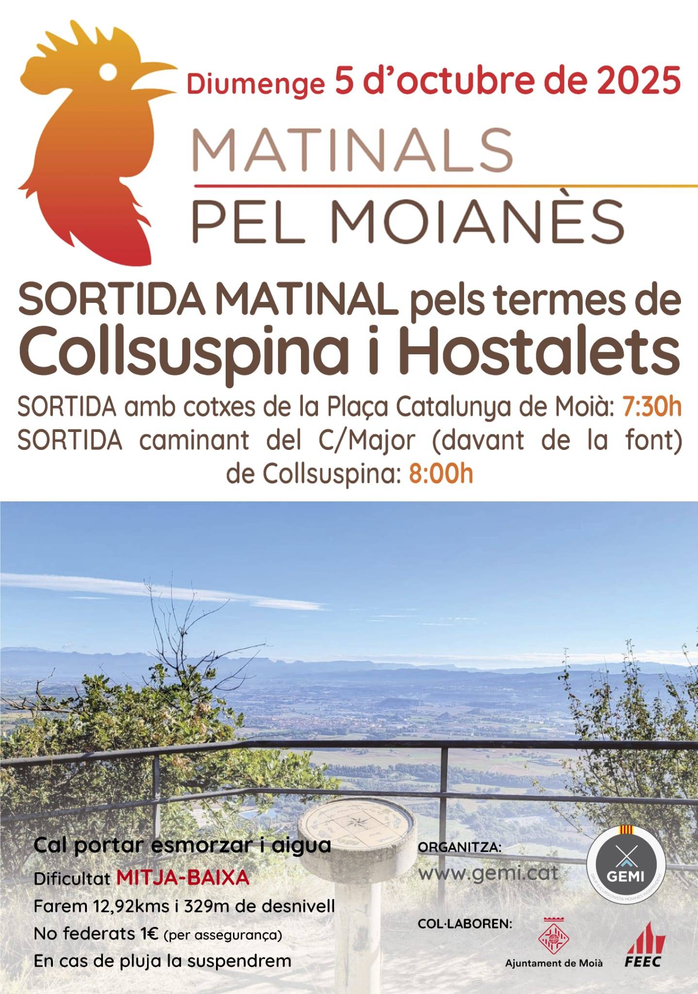 SORTIDA amb cotxes de la pl. Catalunya de Moià: 7:30 h.